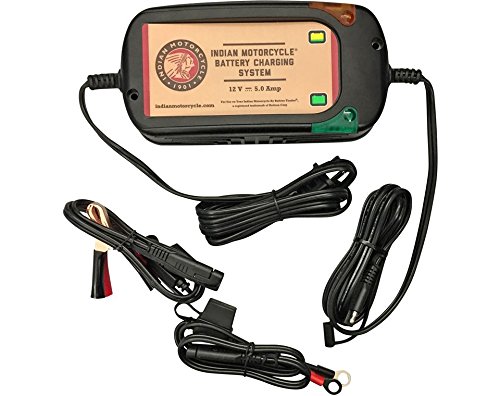 To keep your Indian Motorcycle ready for the road, this 5-amp battery charger will fully charge and maintain a battery at its proper storage voltage without the damaging effects caused by trickle chargers. This versatile charger operates at a higher output rate (5 amps) for a quicker recharge, and it automatically switches to maintenance mode after charging is complete. It's the ideal charger for everyday charging use or long-term storage and maintenance. Kit includes a heavy-duty cigarette lighter adapter that allows convenient charging without accessing the battery terminals every time, and a wiring harness for routing the lead to an easy-to-reach location. It's spark proof, short-circuit protected, and reverse-polarity protected for easy use. Input: 100-240 VAC @ 50/60 Hz. Output: 12 Volts DC @ 5 Amps. 4-Step Fully Automatic Charging (Initialization, Bulk, Absorption, Float).