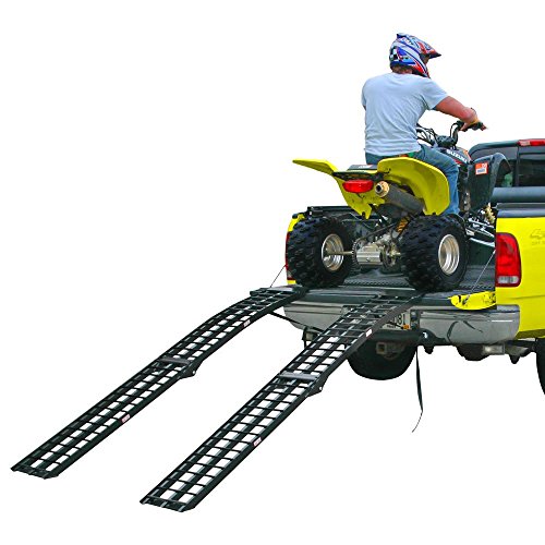 Black Widow folding arched dual runner loading ramps designed for ATV's weighing up to a maximum of 1,200 pounds. Features an integrated hinge system, allowing the ramps to fold in half for compact storage. Great for ATV's, garden equipment, and lawn tractors. Includes (2) safety straps which attach to the ramp and vehicle to prevent ramp kick-outs during loading. Serrated rungs grip off-road tires for added traction. All-Aluminum construction with a pleasing black paint finish. Please note: These ramps are not designed for use with UTV's or Golf Carts.